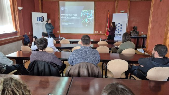 During the lecture, Dr. Stavrić introduced the emerging concept of altermagnets—a new class of magnetic materials that bridge the properties of antiferromagnets and ferromagnets—and discussed their symmetry-driven characteristics and potential applications in spintronics.