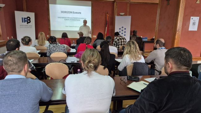 Prof. Dr Goran Stojanović led the session, providing researchers and project teams with practical guidance on preparing competitive proposals for the Horizon Europe program. He shared advice on identifying suitable open calls, setting clear objectives, and aligning project ideas with EU priorities and expected outcomes.