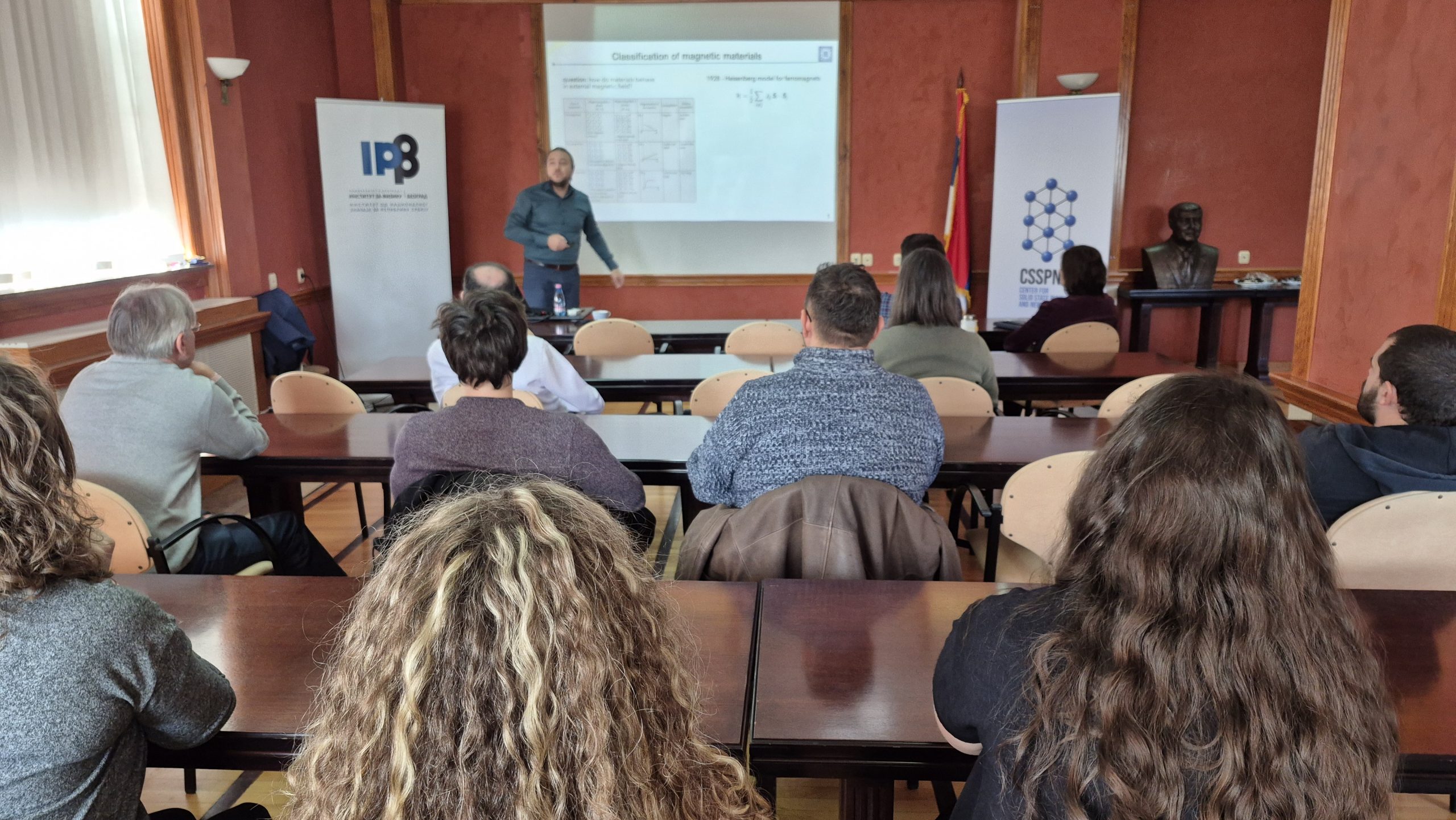 During the lecture, Dr. Stavrić introduced the emerging concept of altermagnets—a new class of magnetic materials that bridge the properties of antiferromagnets and ferromagnets—and discussed their symmetry-driven characteristics and potential applications in spintronics.